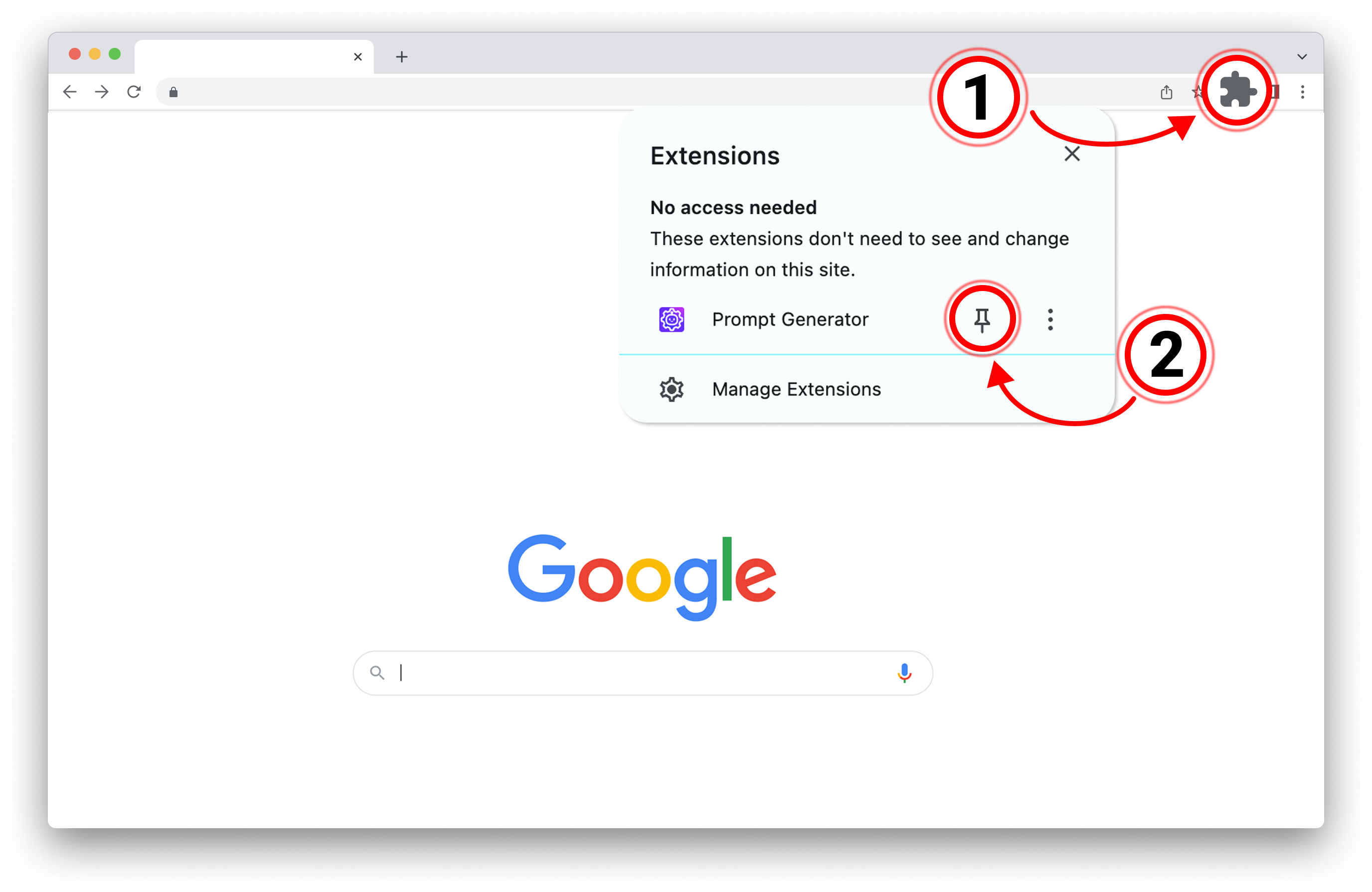 2. Нажмите на маленькую кнопку-пин (2) рядом с AI-расширением Промпт Генератор (Prompt Generator).